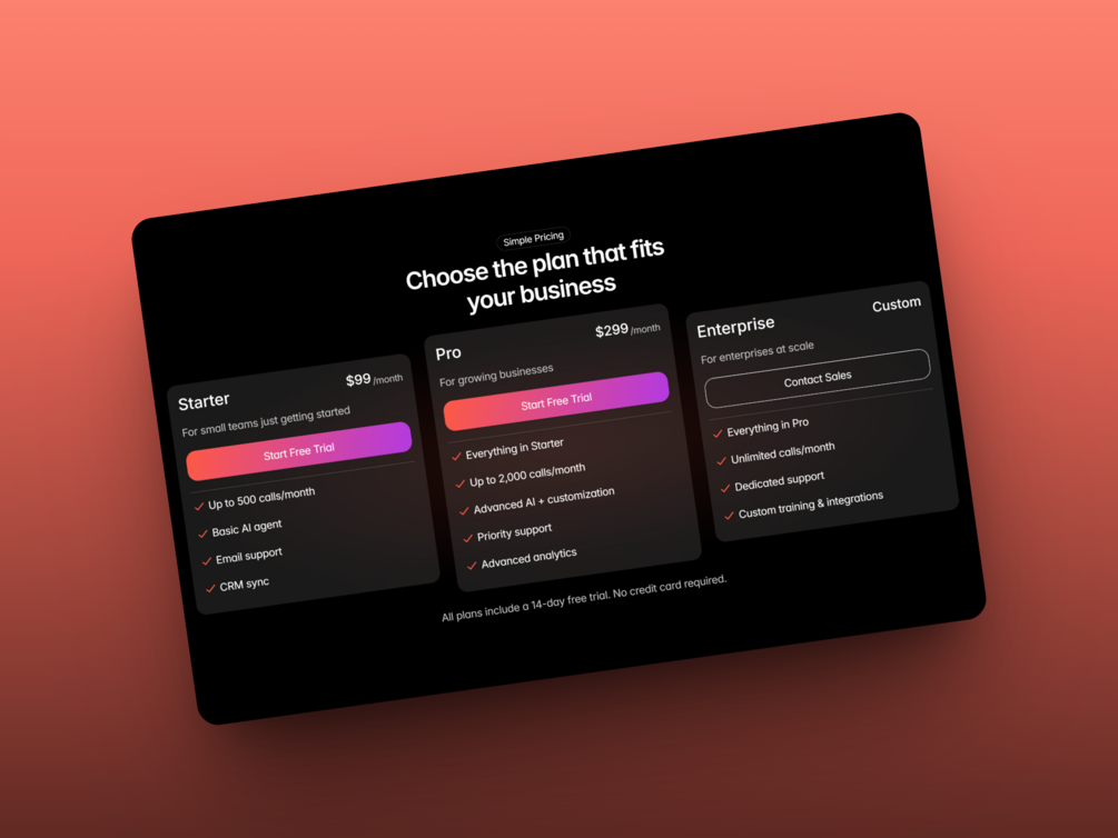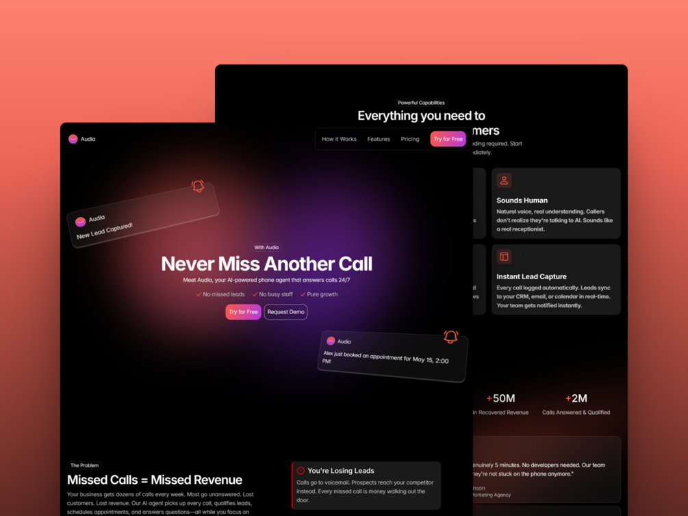 A complete, conversion-optimized landing page template built specifically for AI call agent businesses. Everything you need to launch fast and start selling.